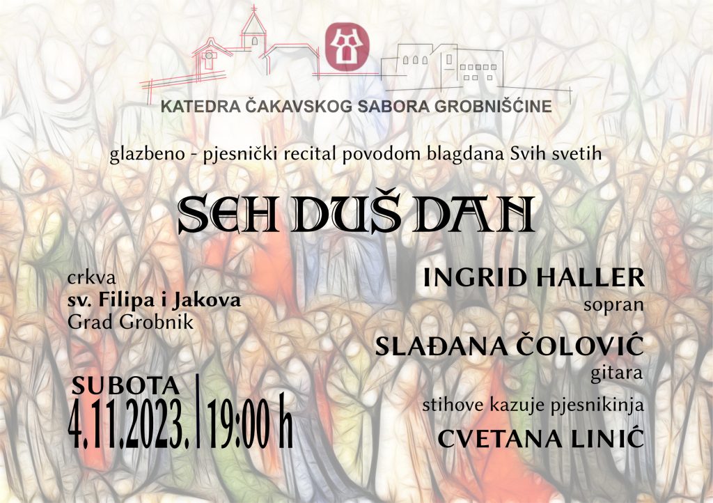 U suradnji s grobničkom župom sv. Filipa i Jakova, ponosno najavljujemo glazbeno-poetsku poslasticu koja će se održati 4.11.2023. u 19:00 sati, u crkvi sv. Filipa i Jakova, Grobnik. Nastupaju: INGRID HALLER, sopran i SLAĐANA ČOLOVIĆ, gitara, a stihove kazuje pjesnikinja CVETANA LINIĆ.