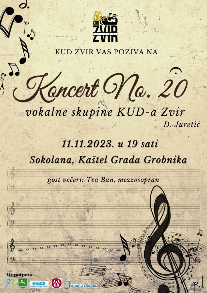 Povodom 20. godišnjice djelovanja, u prostoru Sokolane Kaštela Grobnik, vokalna skupina KUD-a “Zvir” održat će svoj slavljenički koncert pod ravnanjem maestra Davora Juretića.