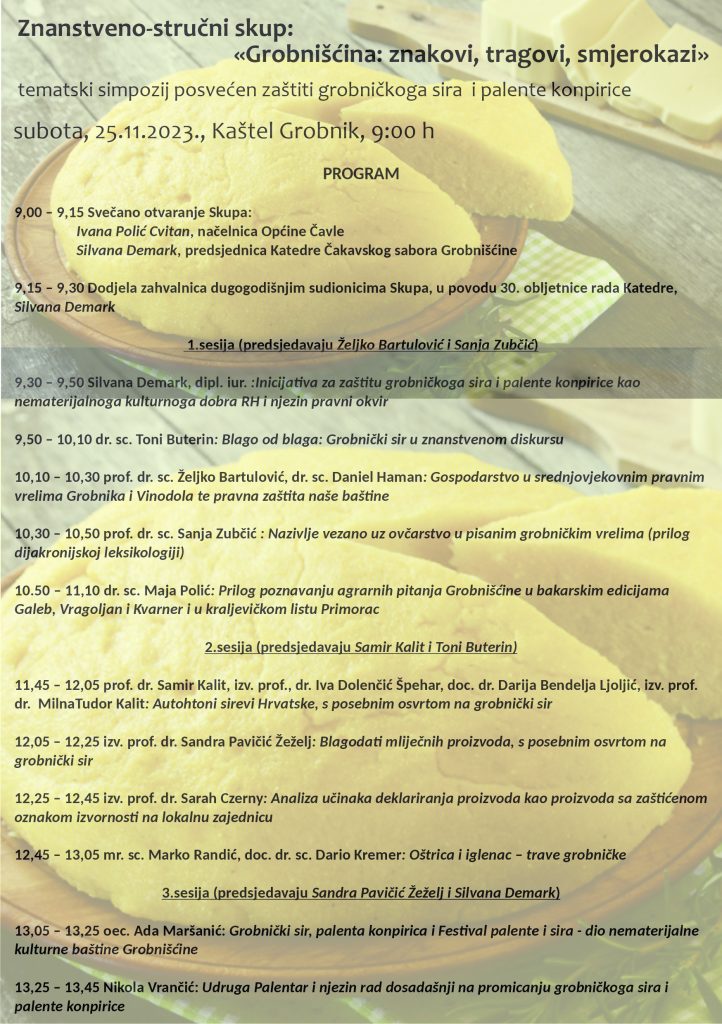 Ovogodišnji je znanstveno-stručni skup u znaku grobničkoga sira i palente konpirice. Katedra Čakavskog sabora Grobnišćine uvidjela je potrebu za zaštitom ovih neizostavnih grobničkih gastro delicija, na kojima su odgojene brojne generacije Grobničana. U prilog toj težnji govorit će hrvatski znanstvenici, stručni na svim poljima direktno i indirektno vezanim uz ovu inicijativu.
